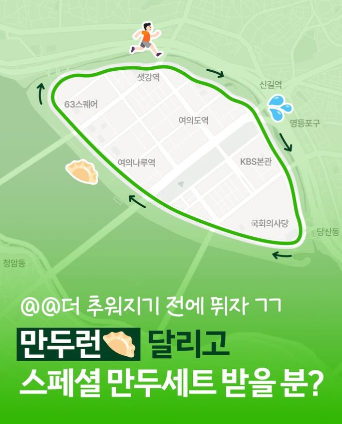 만두 모양의 여의도 러닝 코스를 달린 후 GPS 지도 기록을 SNS에 올리는 이벤트입니다. 여의도 고구마런을 뒤집은 코스로, 반듯하면서도 울퉁불퉁한 라인이 만두와 유사하죠.비비고는 참가자 중 추첨을 통해 10명에게 비비고 스페셜 만두 세트를 선물하겠다고 밝혔습니다. 이벤트 소식을 알린 SNS 게시물에는 "만두런 코스가 귀엽다"는 반응이 잇따랐어요.