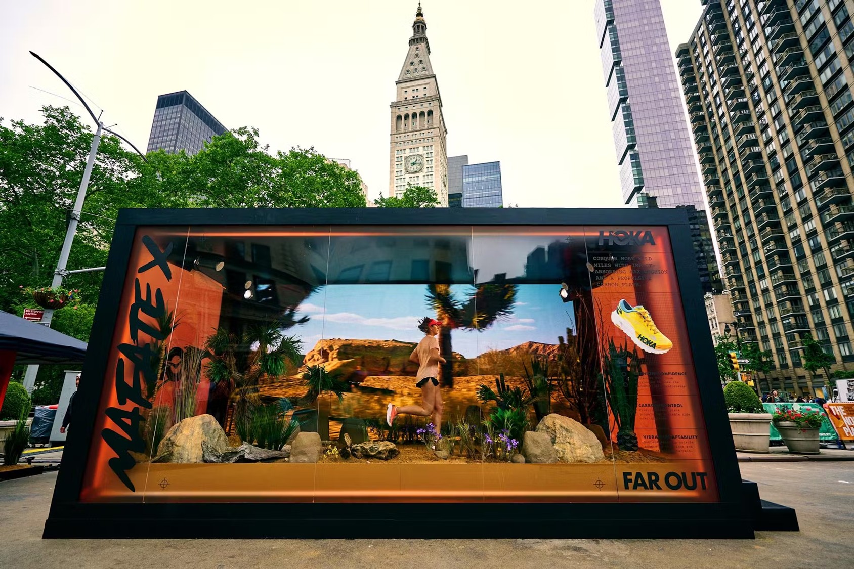 - 이번 공간은 러닝화 '마페테 X(Mafate X)'를 알리기 위한 'Far Out Experience(멀리 떨어진 곳에서의 경험)' 캠페인의 일환입니다. 마페테 X는 사막과 같은 험난한 지형에서 달리는 러너들을 위한 제품인데요. 호카는 마페테 X의 체험을 유도하기 위해 맨해튼 거리에 사막을 구현한 컨테이너 박스를 설치했습니다. 캠페인명처럼 멀리 떨어진 사막에서의 러닝을 도심에서 즐기도록 만든 거죠.