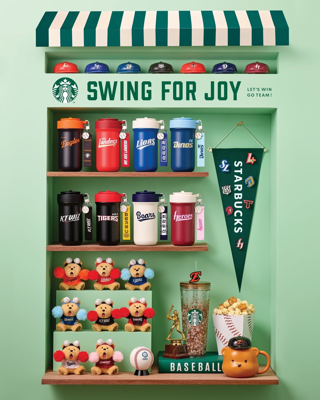 굿즈 라인업도 단순히 실용성에 머물지 않습니다. 캔과 텀블러 기능을 결합한 ‘캔쿨러 텀블러’, 구단 유니폼을 입은 베어리스타 키체인, 팀 모자를 쓴 캡 머그컵까지. 각 구단의 디테일을 반영해 팬들이 자연스럽게 ‘응원하는 팀을 드러낼 수 있는 방식’으로 설계됐습니다.